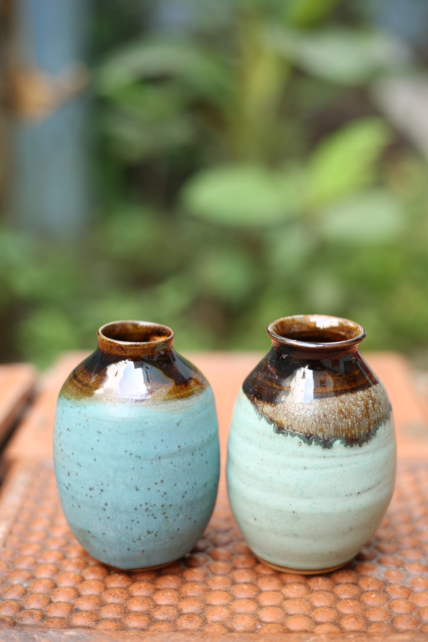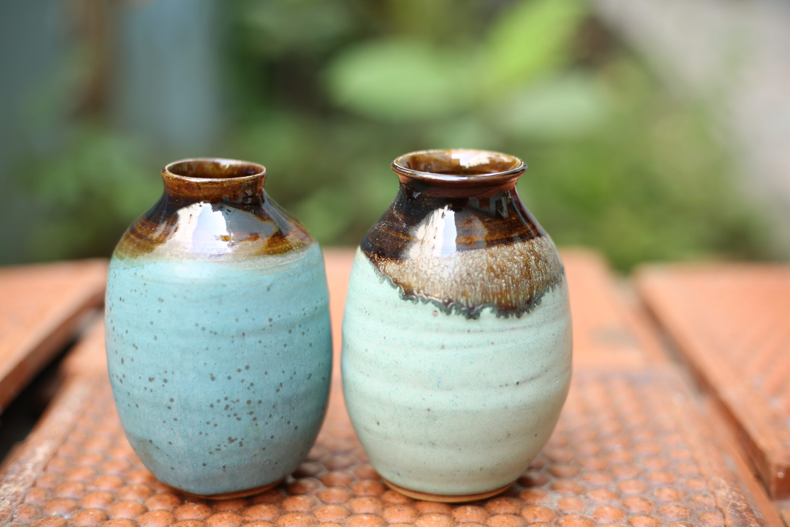 Perfect as bud vases, table accents, or even as standalone statement pieces, they seamlessly blend form and function. Tthe cool turquoise and celadon tones with earthy brown glazes feel like a meeting of water and earth. Their organic drip patterns and soft curves bring a sense of calm and quiet strength to any space.